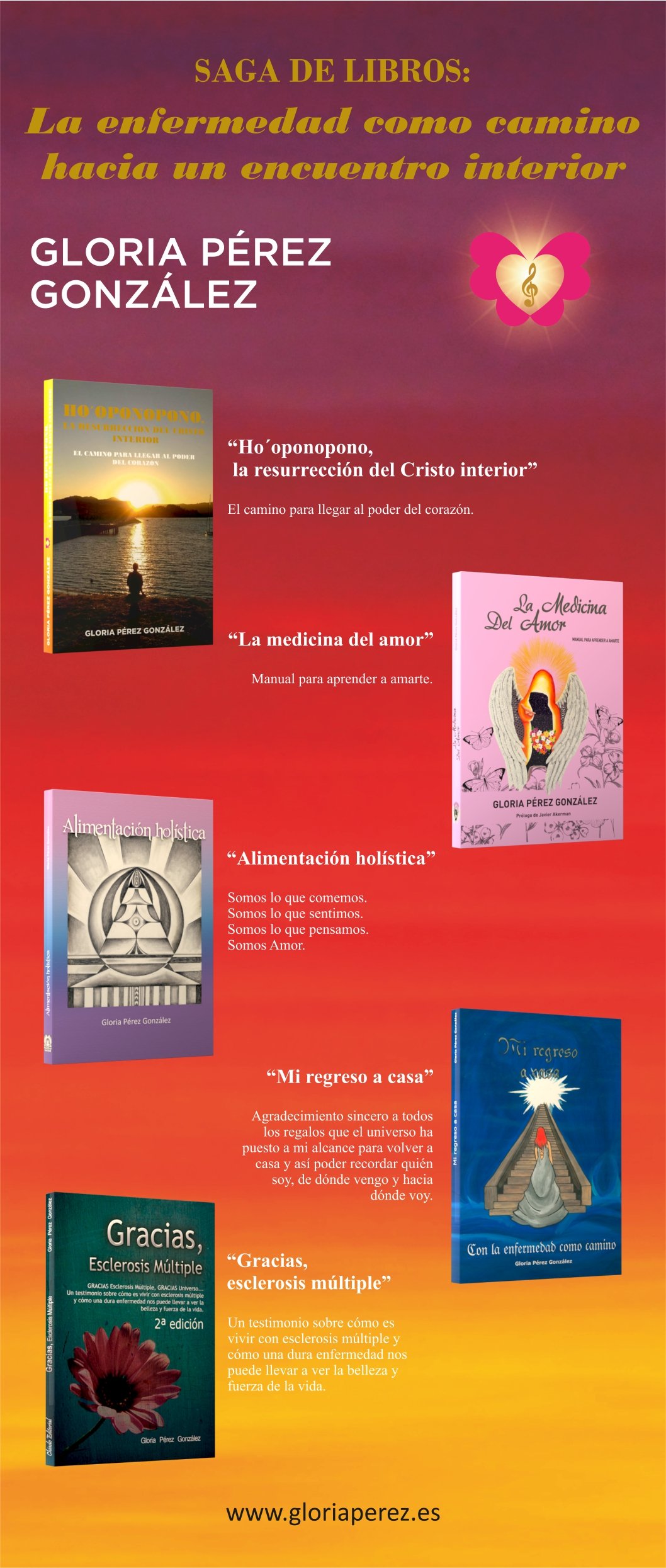 – Has reconocido que las convicciones de tu cuerpo mental también contribuían al desarrollo de bloqueos emocionales, has optado por cambiar esas convicciones de lo que estaba bien o lo que estaba mal respecto de ti misma y de los demás, has recordado la mejor medicina, la medicina del amor que has puesto en práctica primero y has dado a conocer más tarde en tu cuarto libro La Medicina del amor, has recordado lo importante que era aprender a amarte, perdonarte en un primer momento a ti misma, dejar de culparte y de juzgarte ( has hecho un trabajo intenso del perdón que has dado a conocer en tu último libro Ho´oponopono, la resurrección del cristo interior), en esta tu última obra das a conocer a tus lectores como se puede llegar a vivir en un primer momento guiándote por los mensajes que yo te hacía llegar para recordar más tarde como vivir escuchando la voz del corazón, recuperando la conexión con el cristo interior que todos portamos en el corazón.
